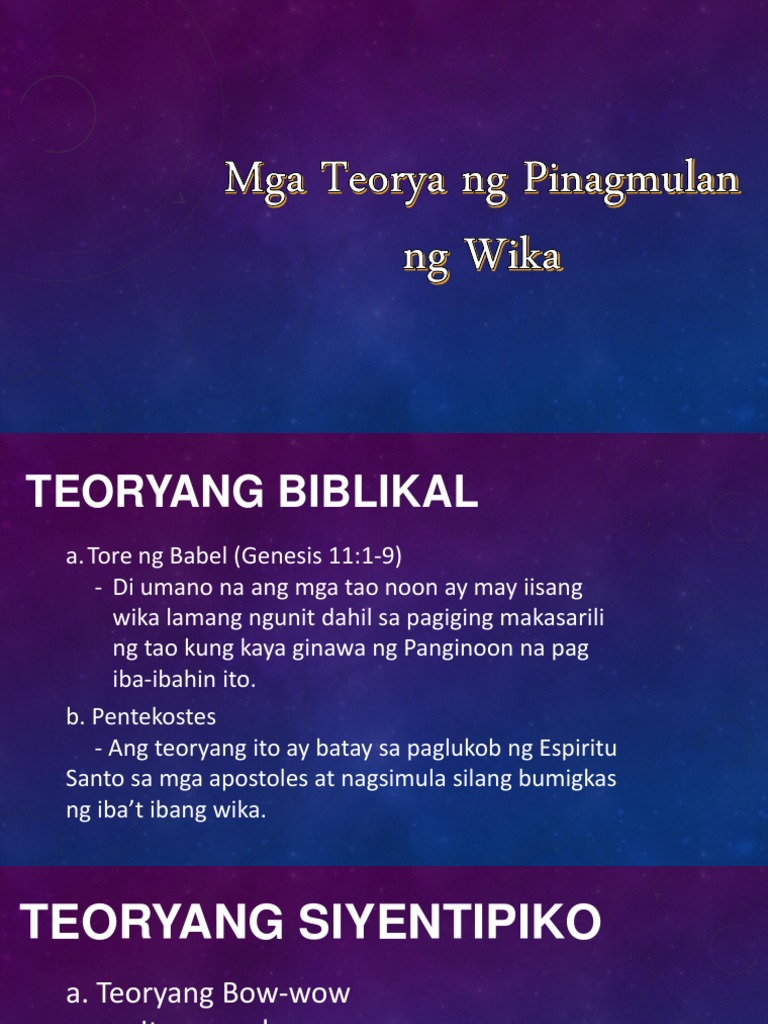 Dito nilalaman ang Teorya ng Wika katulad ng Teorya ng Babel Teoryang Yum-yum at iba pa. Pansinin nga naman ang mga bata. 31102016 May mga haka-haka o mga teoryang nagsasabing ang wika ay nanggaling o ibinatay sa mga materyal na bagay na nakikita at ginagamit ng tao sa paligid.