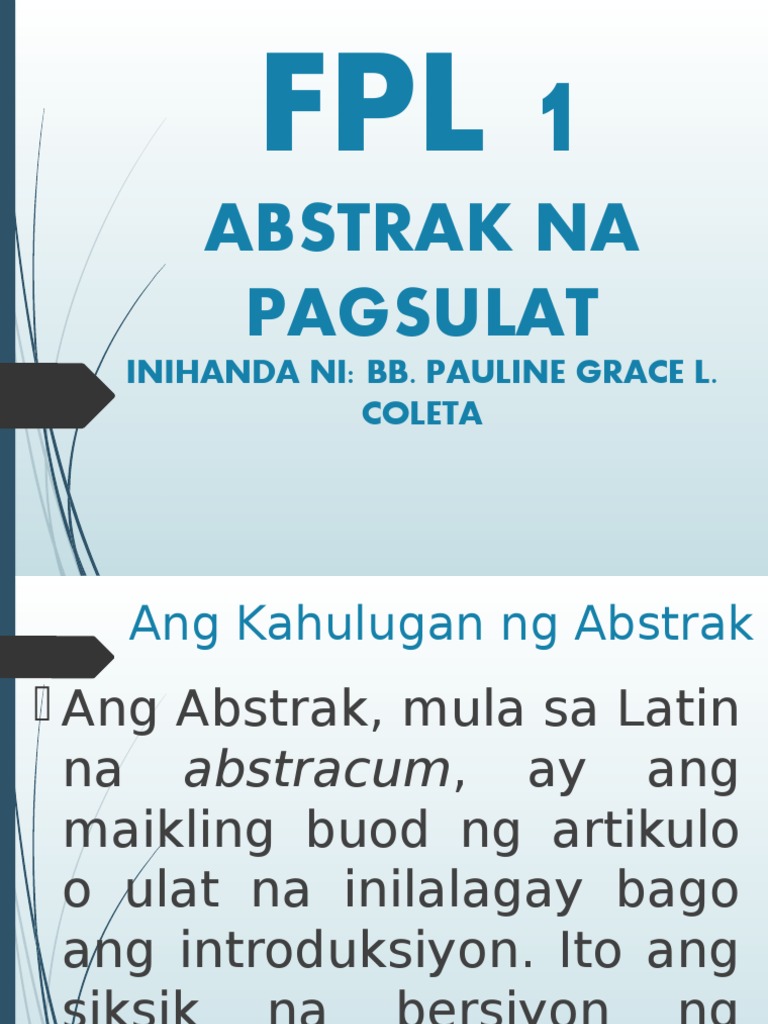 Abstrak - Isang maikling buod ng artikulo ulat at pag aaral na inilalagay bago ang introduksiyon. Karaniwan na ay ito ang pinipiling paraan ng pagsulat sa mga propesyonal na mga akda anumang researches at mga scientific articles. Mahalaga ang akademikong pagsulat sapagkat ito ang magiging tulay o mabisang daluyan ng pagtatalakay at pag unawa sa mga kaisipang intelektuwal na kabilang sa sulating akademiko.