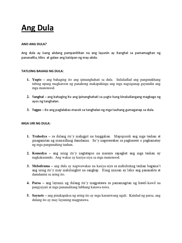 Ano ang mga uri ng dulang pilipino. 19112020 MGA URI NG DULANG PANLANSANGAN 1. 17102011 Ano-ano ang mga uri ng antas ng lipunan noong sinaunang panahon. 232012 Samakatuwid ang tunay na dulang Pilipino ay nagbibigay ng mas malawak na pang-unawa sa kulturang Pilipino at nagbibigay ng kasagutan sa mga pangangailangan ng mga Pilipino.