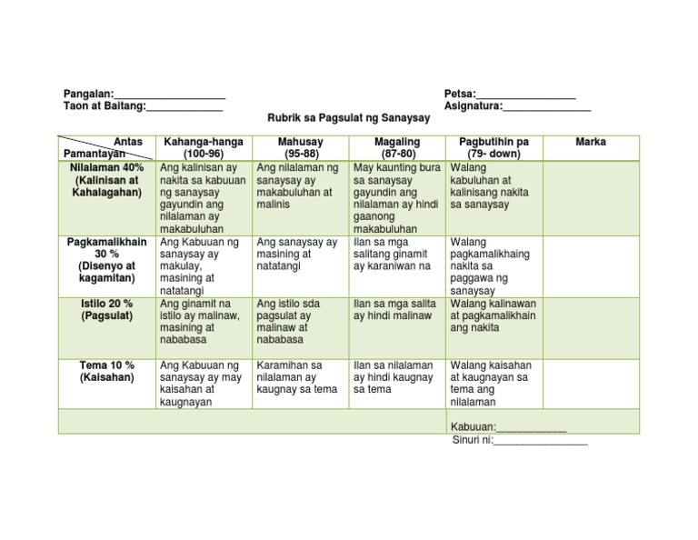 View Rubrics - Pagsulat ng Sanaysaydocx from FILIPINO 6 at Philippine Normal University. 12012020 RUBRICS SA PAGMAMARKA NG SANAYSAY - 7886269 lysliedurangparang11 lysliedurangparang11 01122020 Araling Panlipunan Junior High School answered RUBRICS SA PAGMAMARKA NG SANAYSAY 1 See answer 977920748a 977920748a Answer. Pagkakasunod-sunod ng mga inilahad na kaisipan 4 x2 Nilalaman Gumamit ng Sanhi at Bunga at Paghahambing sa pagbuo ng talata 4 Kakintalan Nag-iwan ng malalim na impresyon sa isipan ng mga mambabasa upang mahikayat ang mga ito.