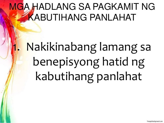 1462015 MGA HADLANG SA PAGKAMIT NG KABUTIHANG PANLAHAT. Pagkakaroon ng pakiramdam na mas malaki ang naiiambag ngsarili kaysa sa nagagawa ng ibac. Paggawa ng tao ayon sa kanyang pansariling hangadb.