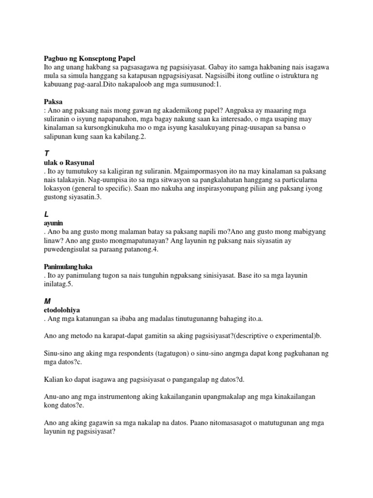 27012015 pagbuo ng tentatibong balangkas paghanda sa bibliogaphy pagpapahalaga paggamit at pagsasaayos ng mga datos pangangalap ng mga datos pagbuo ng konseptong papel pagpili at paglimita ng paksa mga hakbang sa paggawa ng sulating pananaliksik pagbuo ng faynal na balangkas pagsulat ng. KONSEPTONG PAPEL SA PANANALIKSIK SA FILIPINO II IMPLUWENSYA NG POP CULTURE TRENDS SA MGA KABATAAN Ang Konseptong Papel na ito ay inihahandog sa mga guro ng Palawan State University bilang b ahagyang katuparan ng mga kinakailangan para sa Degree sa Bachelor of Science in Accountancy Ipinasa nina. Nakaangkla sa laranangan o propesyong pinili.