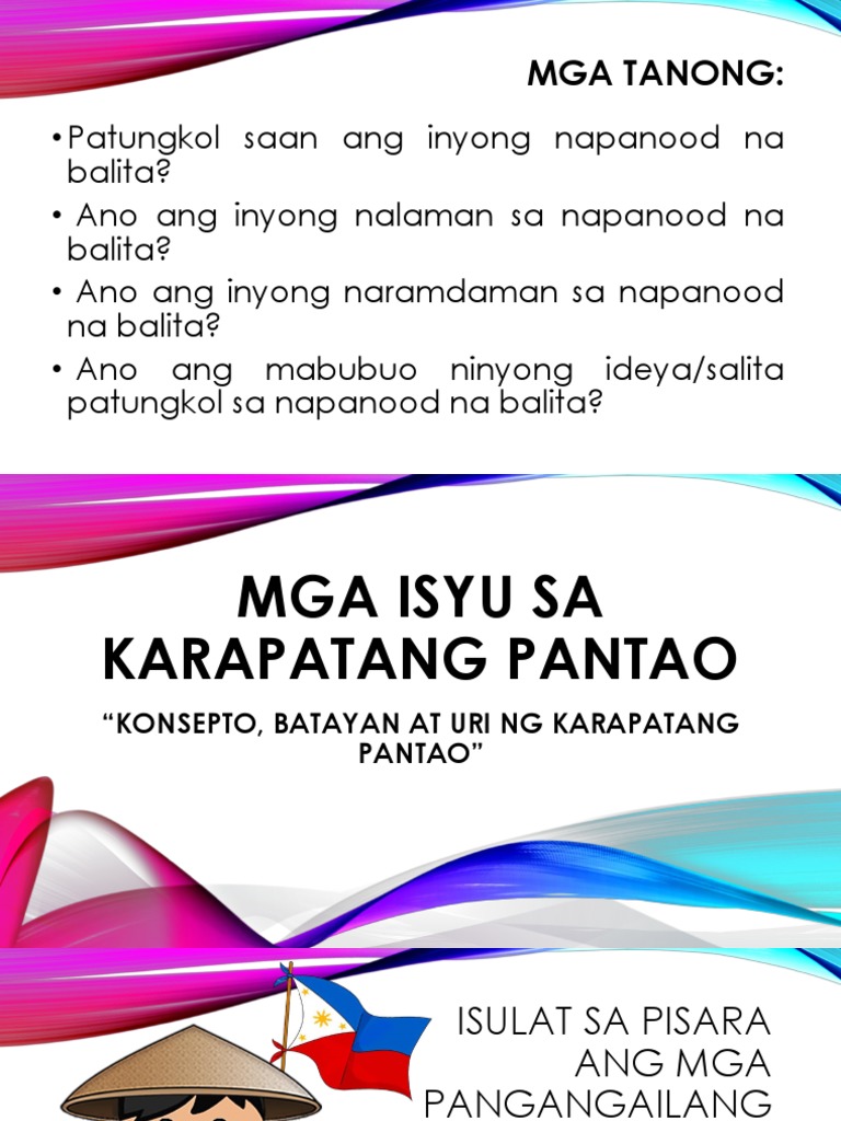 Ano ang kahulugan ng isyung karapatang pantao. Ang pangkalahatang mga karapatang pantao ay isinasaalang-alang sa batas mga konstitusyon kasunduan at sa internasyunal na batas. Ang mga karapatang sibil at pulitikal ng mga Pilipino ay nasa Bill if Rights Art. Upang mayroong patas na paglilitis at due process ng batas.