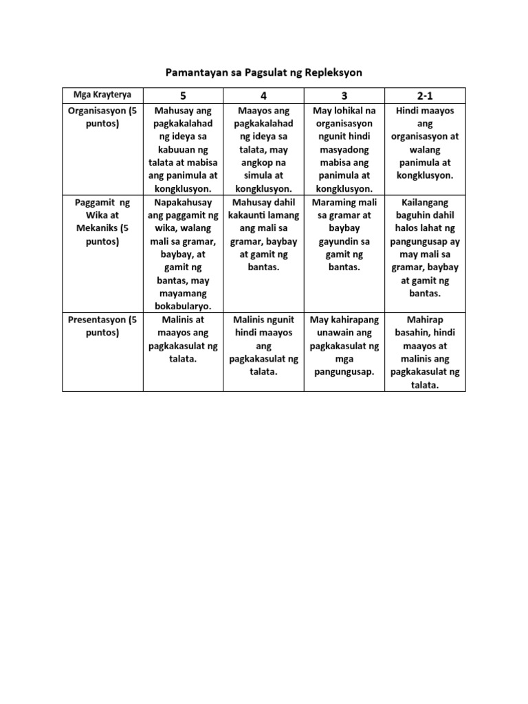 Pamantayan Sa Pagsulat Ng Repleksyon