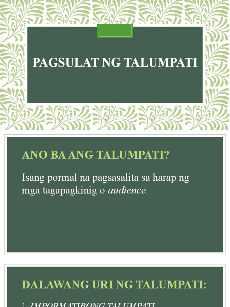 Ito ay ang talumpating pampalibang nagpapakilala pangkabatiran nagbibigay-galang nagpaparangal at pampasigla. 2Talumpating nagpapakilala Tinatawag din itong panimulang talumpatiKaraniwan itong maikli lalo na kung ang ipinakikilala ay kilala na o may pangalan naLayunin nito ay ihanda ang tagapakinig at pukawin ang kanilang atensyon sa kahusayan ng. Kakaiba ito sa ginagawa nating pagsasalita sa araw araw at sa iba pang anyo ng panitikan.