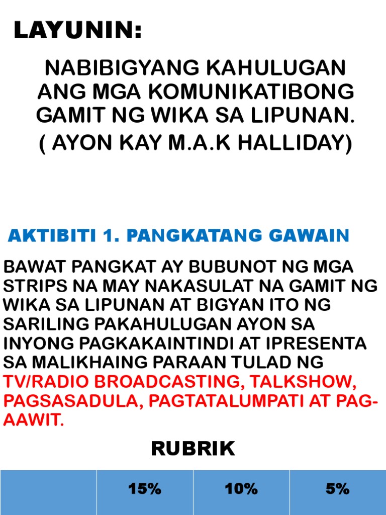 Kasunod nito atin ding masasabi na ang komunikasyon ay isa sa mga mahahalagang pondasyon ng anomang lipunan. PANGKATANG GAWAIN BAWAT PANGKAT AY BUBUNOT NG MGA STRIPS NA MAY NAKASULAT NA GAMIT NG WIKA SA LIPUNAN AT BIGYAN ITO NG SARILING PAKAHULUGAN AYON SA INYONG PAGKAKAINTINDI AT IPRESENTA SA MALIKHAING PARAAN TULAD NG. Layunin sa Aralin 1.